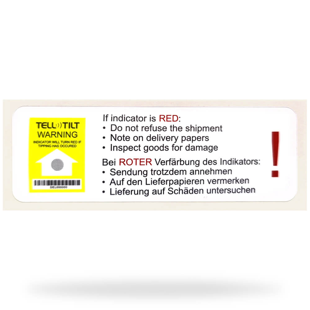 Schutzfolie auf der Rückseite entfernen und den Indikator direkt am Versandgut anbringen. Der TELLTILT löst von „Weiß“ auf „Rot“ aus, sobald das Packgut um mehr als 85° geneigt wird.