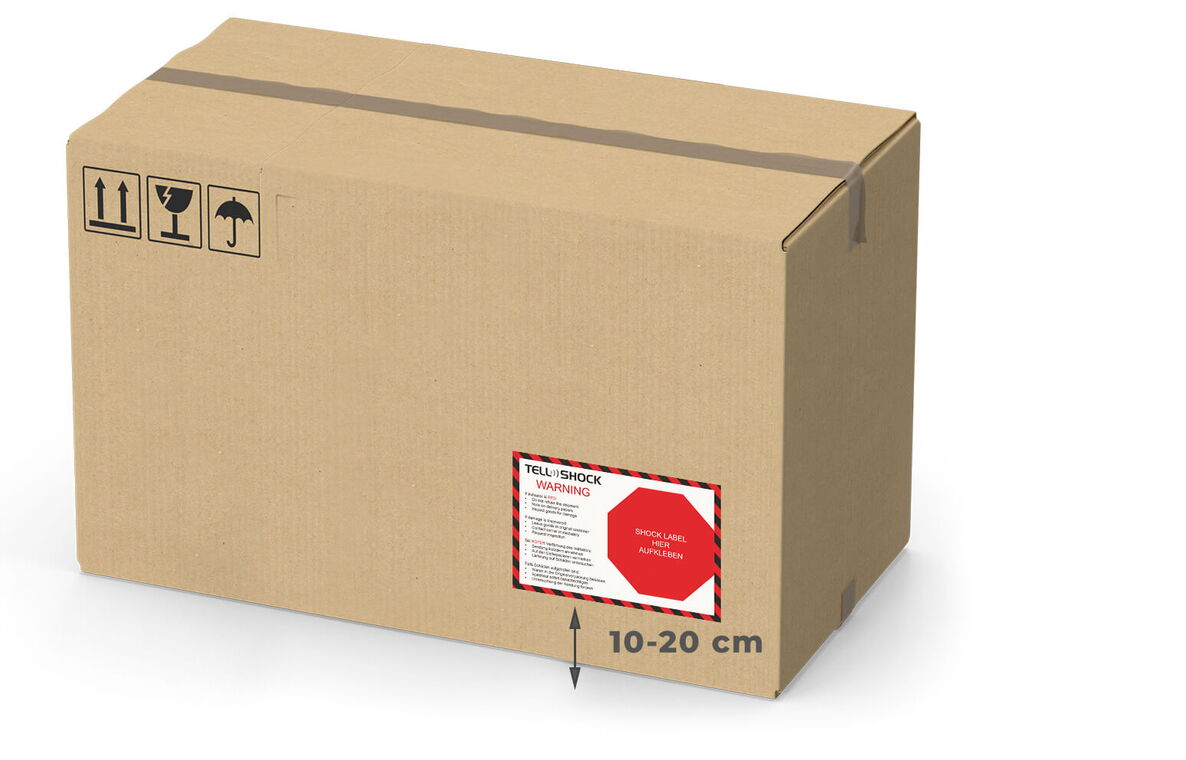 The best control is achieved by attaching two TELLSHOCK indicators. For transport goods of approx. 1.00 m edge length and above, you must use one TELLSHOCK indicator on each of the diagonally opposite sides at the same distance from the floor.